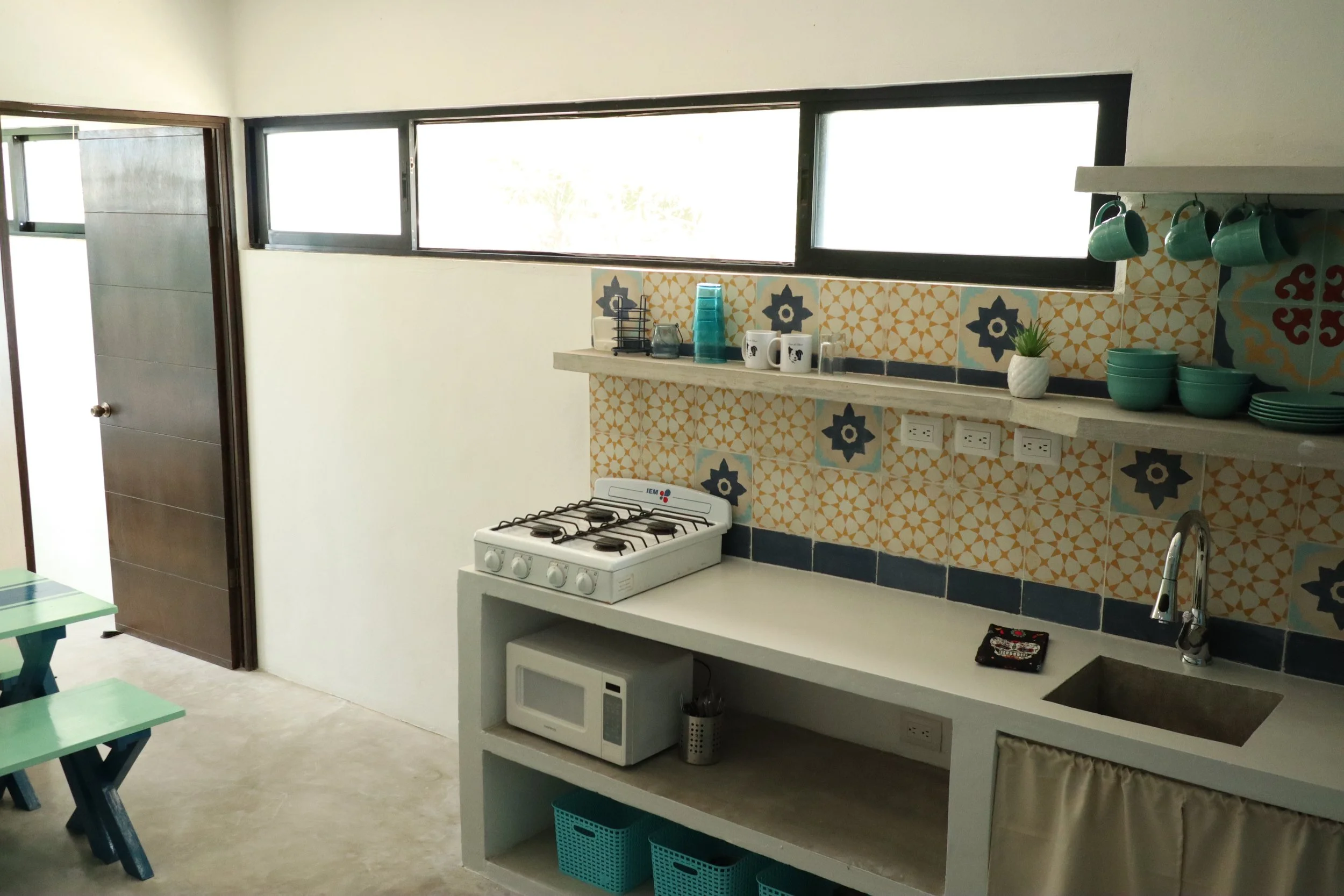 The charming two-story guest home offers privacy and comfort, thoughtfully designed with natural light and timeless pasta tile floors throughout. The ground floor features a cozy sitting area, a well-appointed bedroom, and a stylish bathroom with an open-air shower that brings the outdoors in. Upstairs, a sunlit kitchenette and dining area provide everything needed for relaxed living, along with an additional bedroom—ideal for hosting guests or creating a peaceful retreat.
