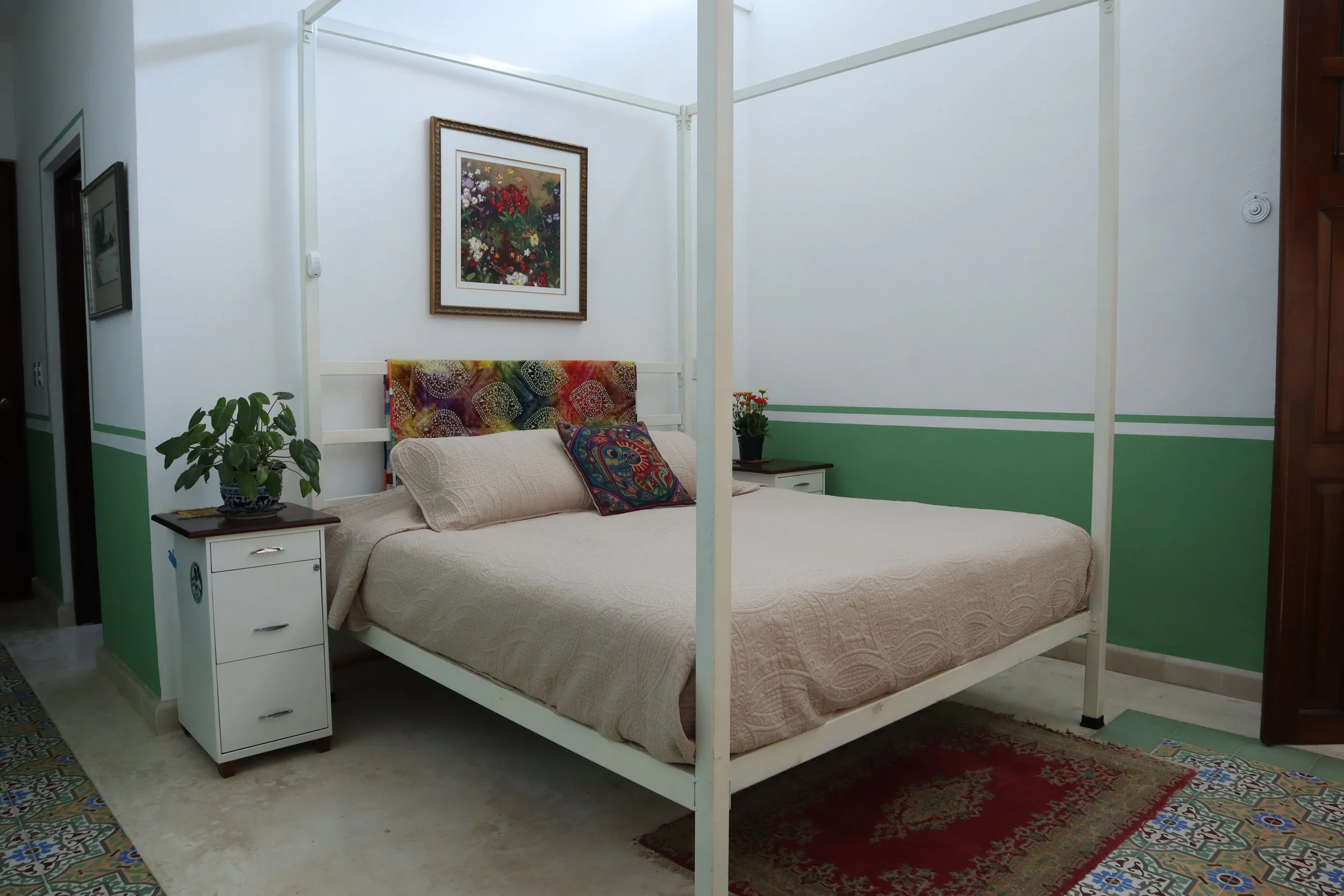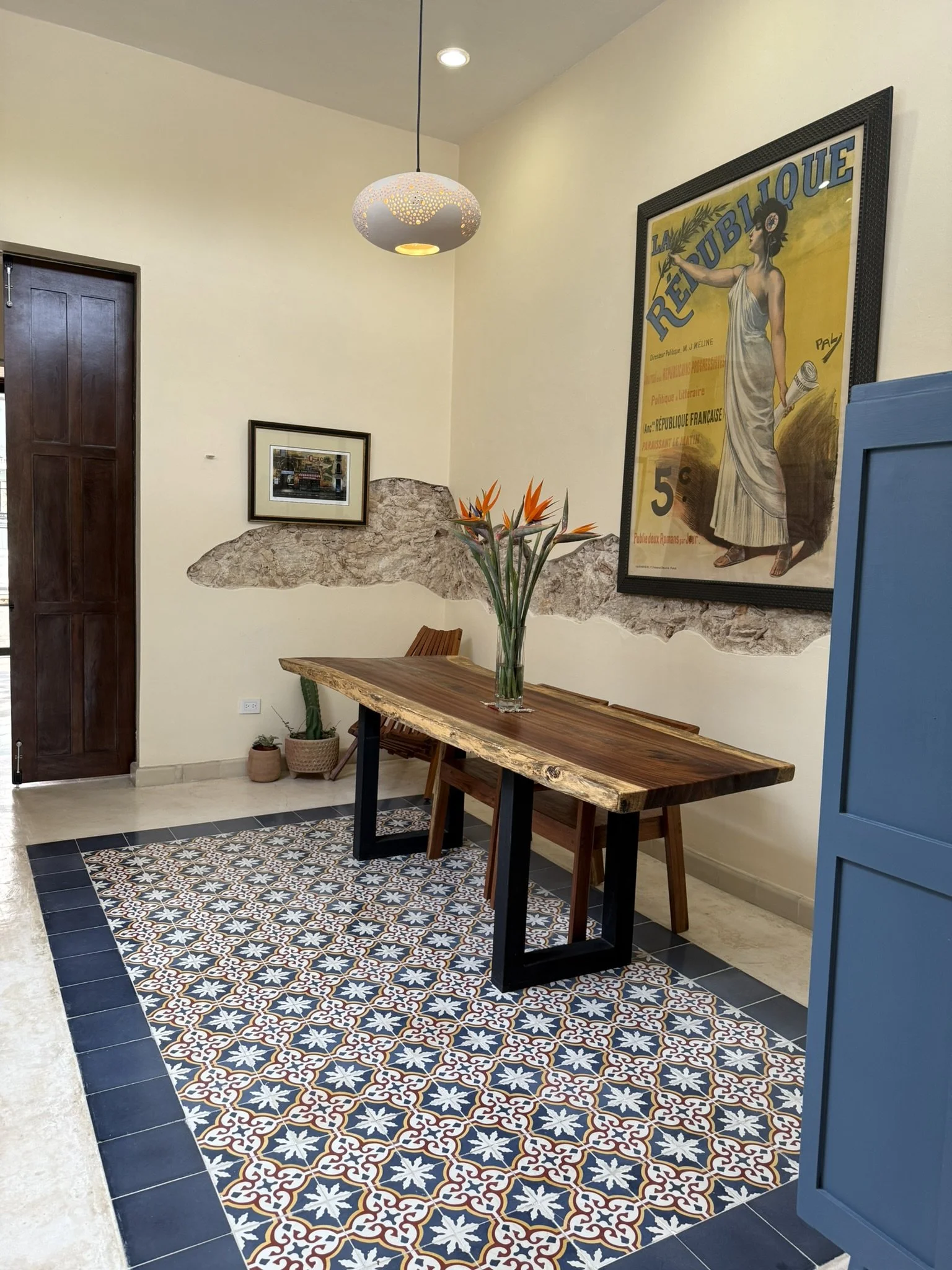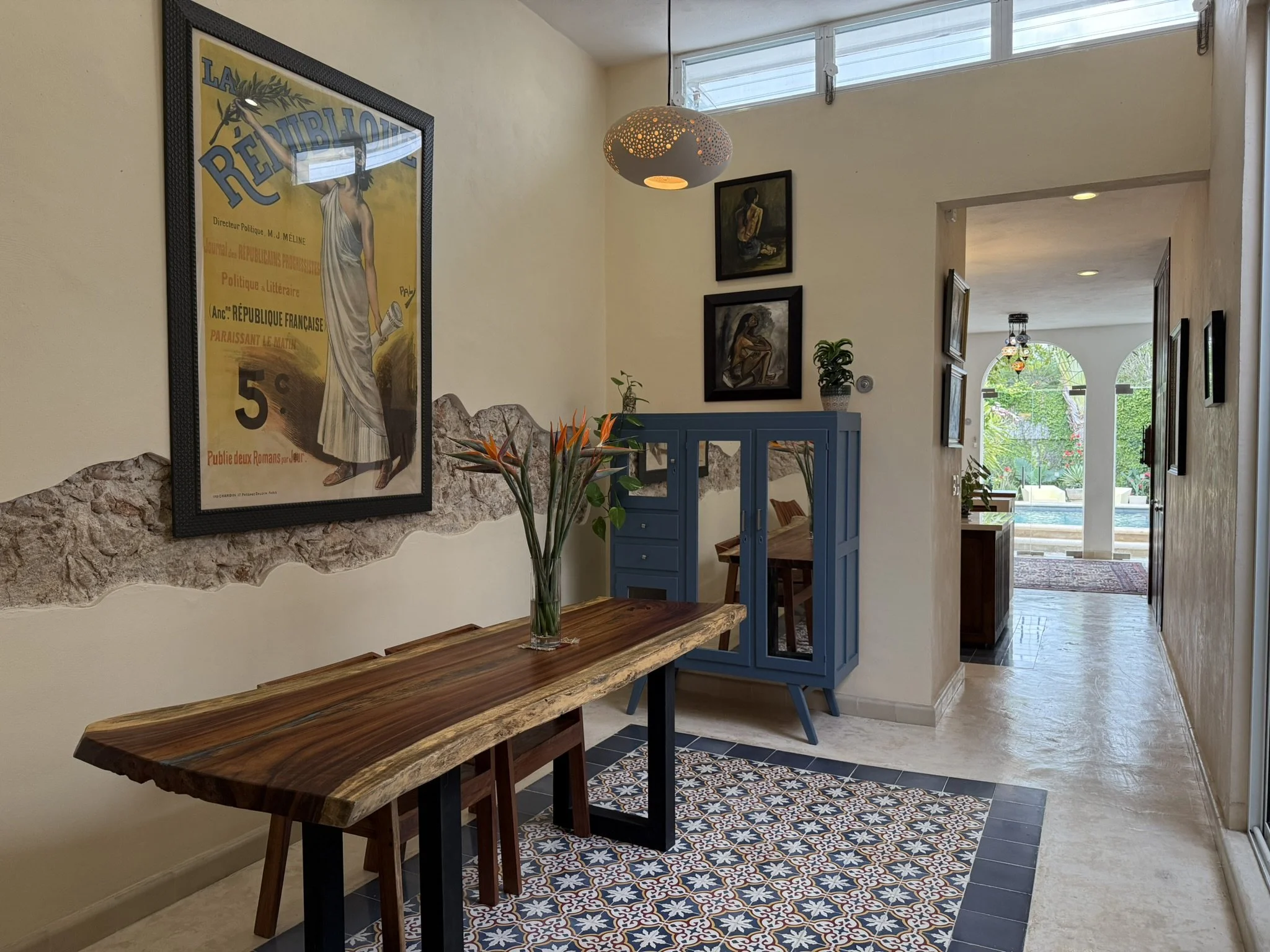 Step into a grand colonial entry hall where handmade pasta tiles, tall beamed ceilings, and thick mampostería walls create a welcoming mix of tradition and character. It’s a space that captures the soul of Mérida’s architectural heritage.