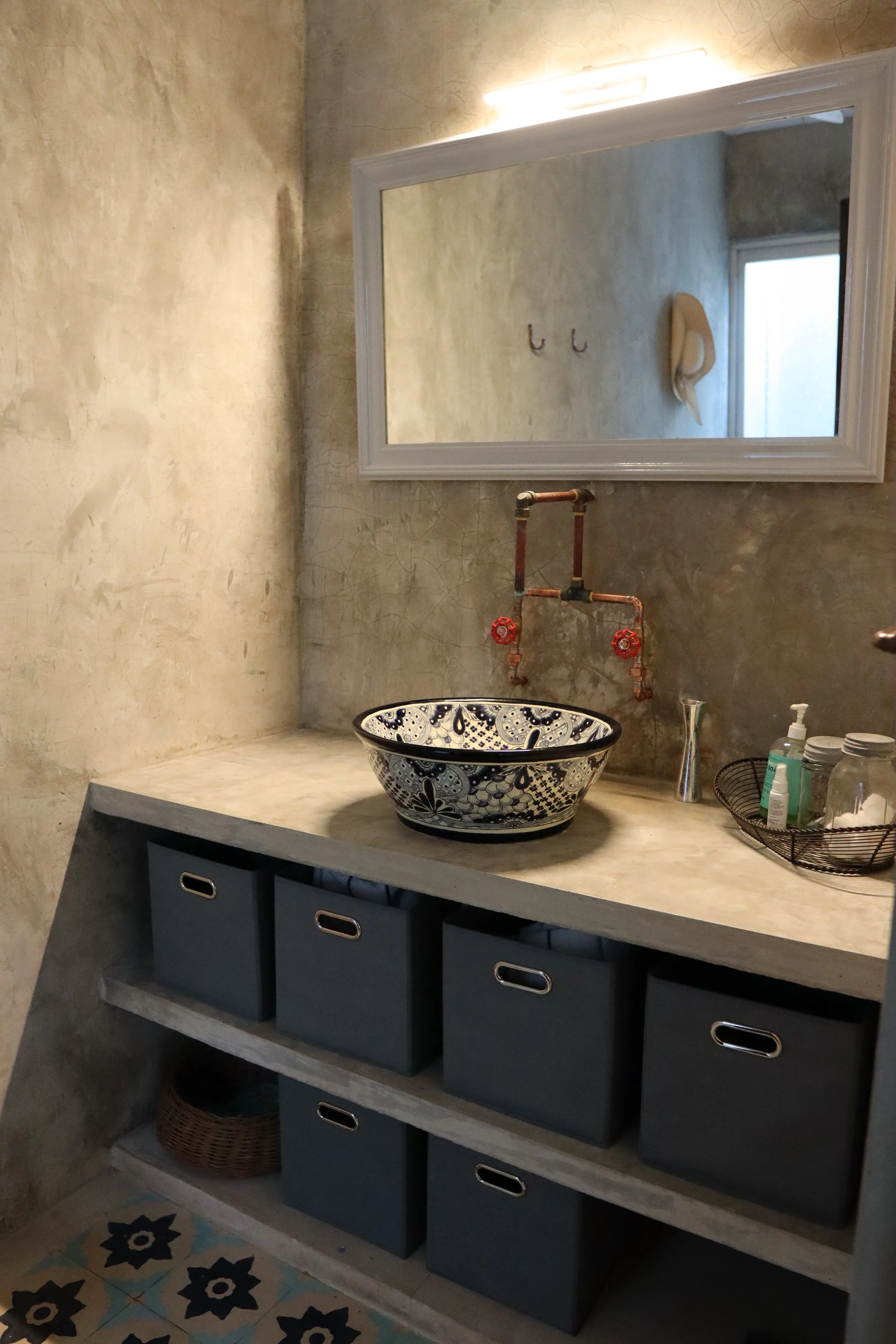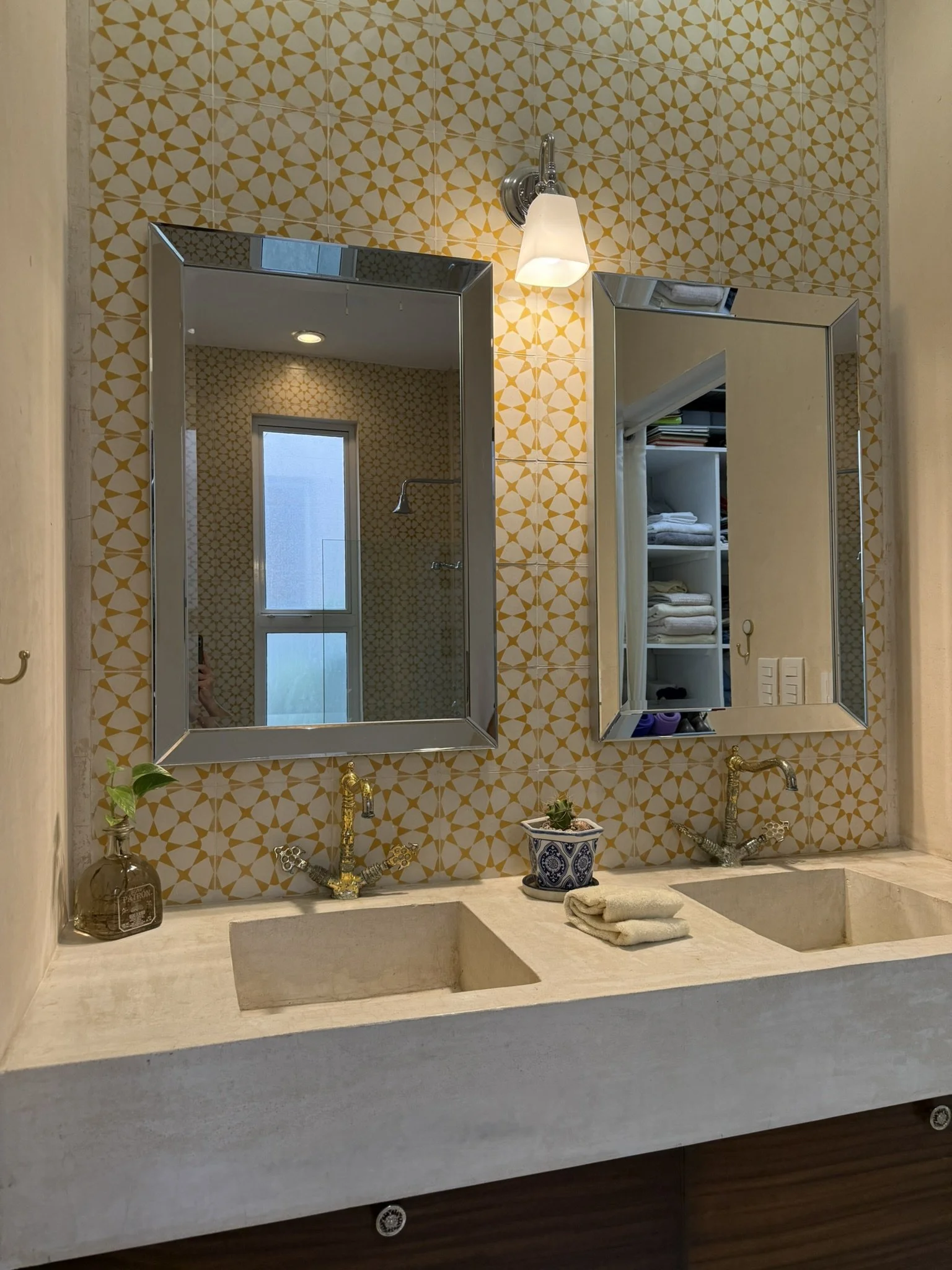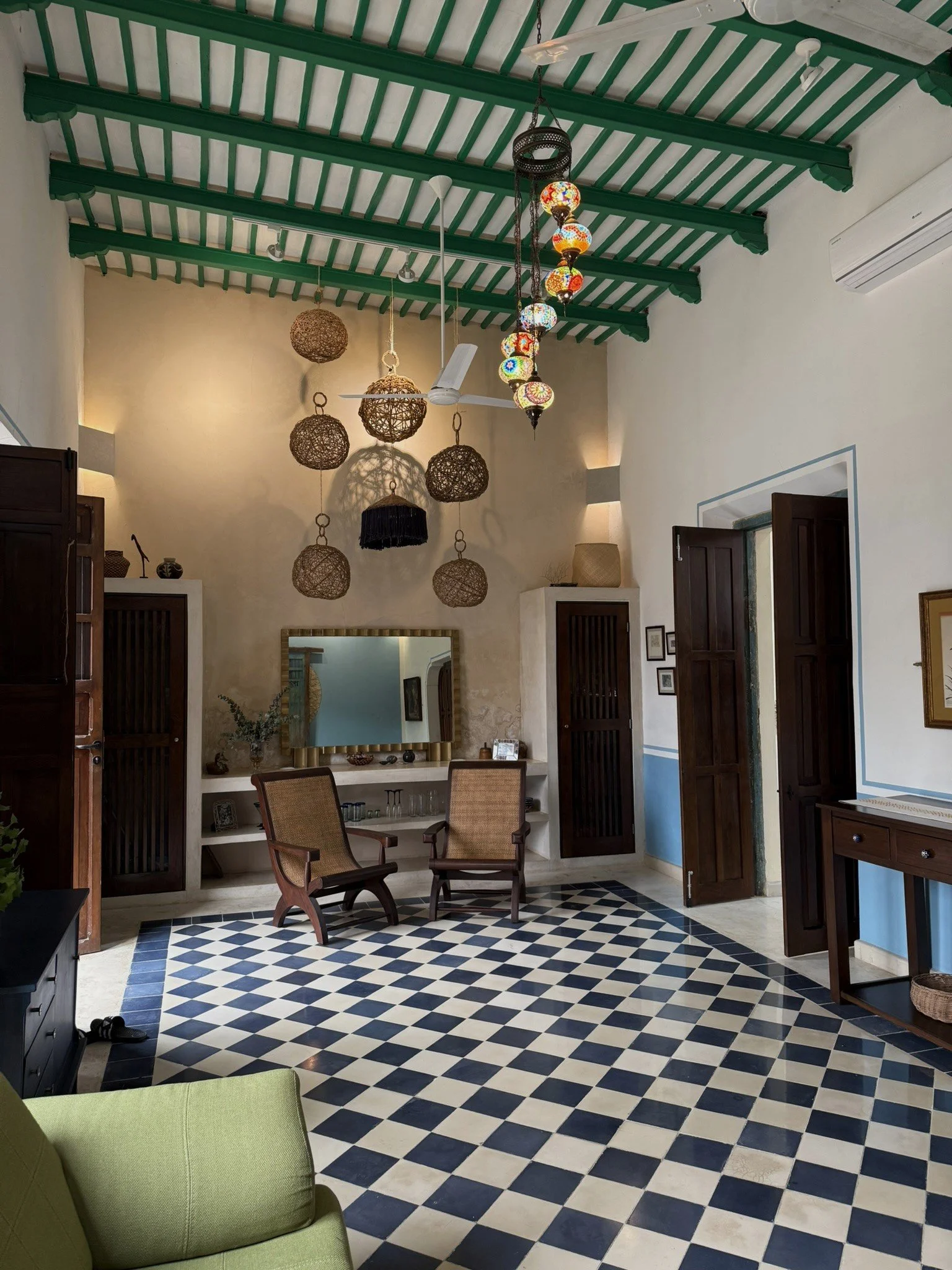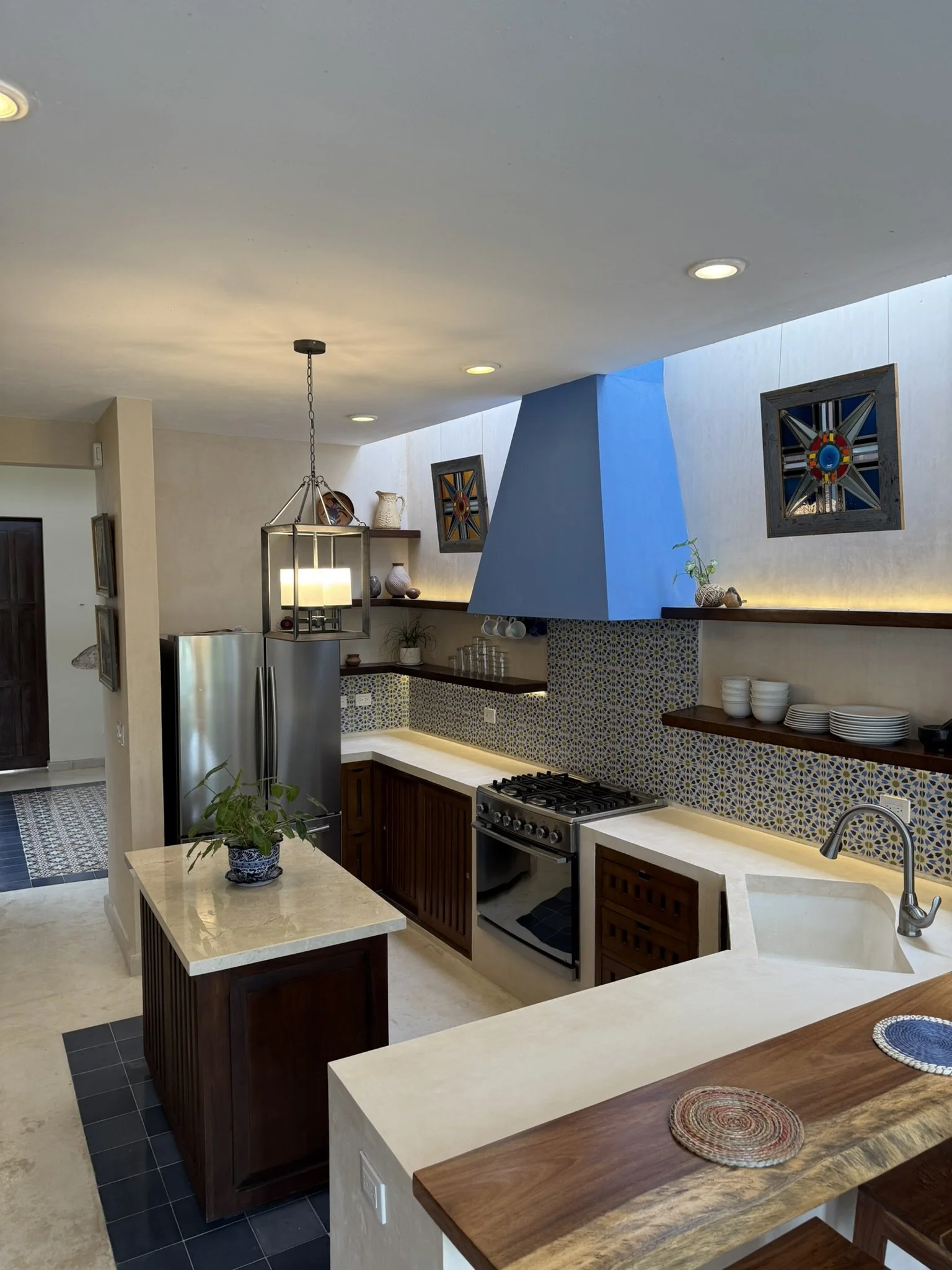 Step into a grand colonial entry hall where handmade pasta tiles, tall beamed ceilings, and thick mampostería walls create a welcoming mix of tradition and character. It’s a space that captures the soul of Mérida’s architectural heritage.